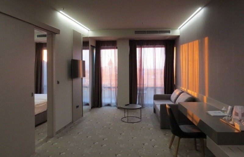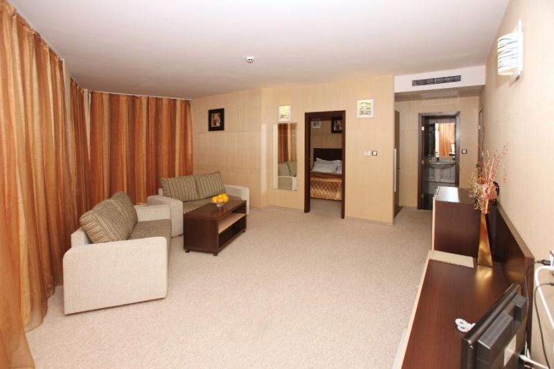 Smeštaj: Hotel raspolaže sa 99 luksuzno opremljenih apartmana. Svi apartmani se sastoje od spavaće sobe sa francuskim ležajem, dnevnog boravka sa sofom na razvlačenje, kupatila, terase. U apartmanima postoji satelitska TV, frižider i ketler.