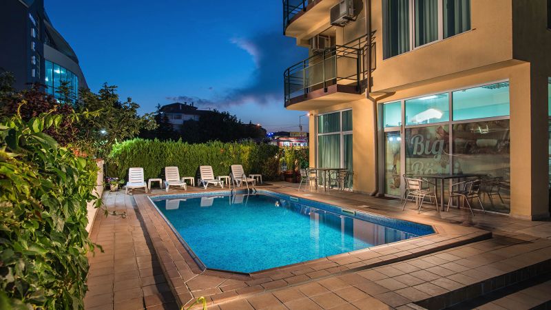Sadržaj kompleksa: otvoreni bazen sa delom za decu, restoran, bar, sauna, parno kupatilo, đakuzi, masaže, fitnes, dečije igralište, parking, Wi-Fi internet
