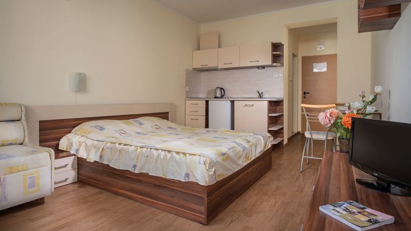 Studio za 2-3 osobe (2+1) – površine 40 m², jedna prostorija sa francuskim ili dva odvojena ležaja, i sofom na razvlačenje, namenjen smeštaju max 3 odrasle osobe ili 2 odrasle osobe i jednog deteta.