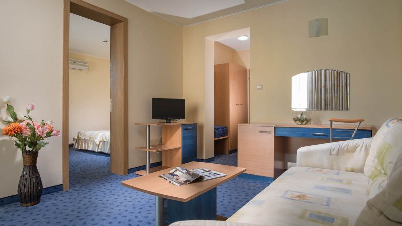 Suite za smeštaj 2-4 osobe (2+2): dve prostorije koje nisu odvojene vratima, francuski ili dva odvojena kreveta i sofa na razvlačenje; namenjen smeštaju minimalno 2 odrasle osobe, a maksimalno 2 odrasle osobe i dvoje dece ili 3 odrasle osobe i jednog deteta.