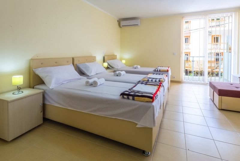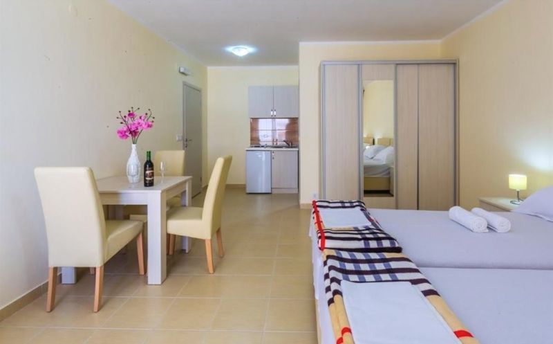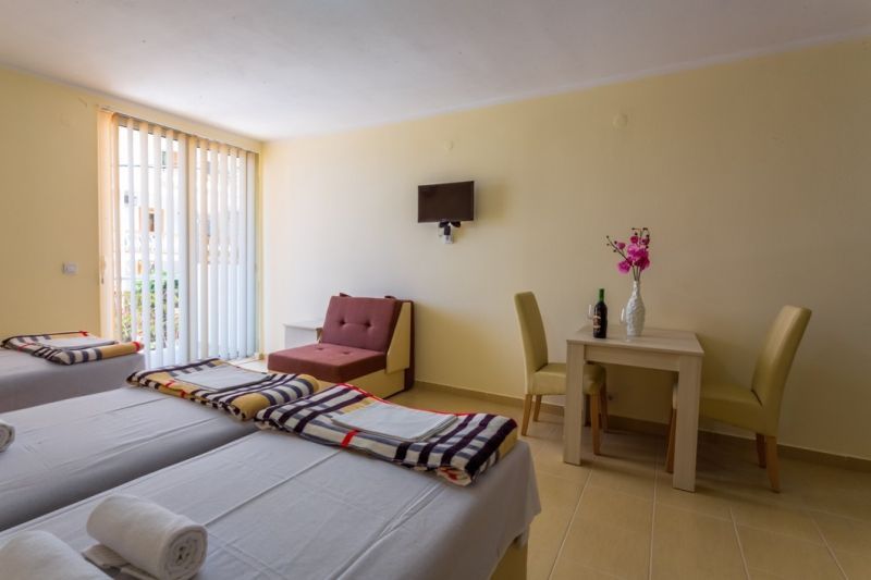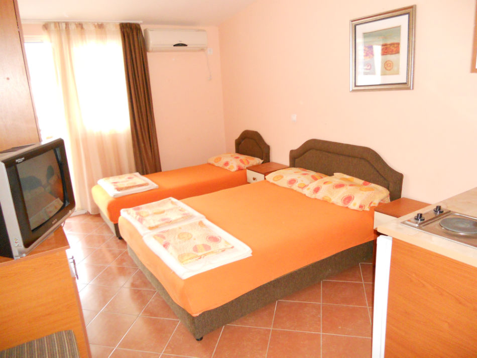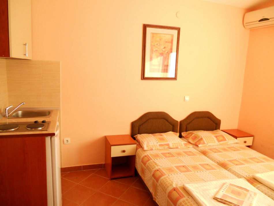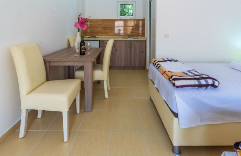 Moderno opremljeni studio-apartmani za dve , tri ili četiri osobe poseduju sopstveno kupatilo, terasu, TV-satelitski program, internet, frižider, klimu, mini kuhinju sa komplet opremom.