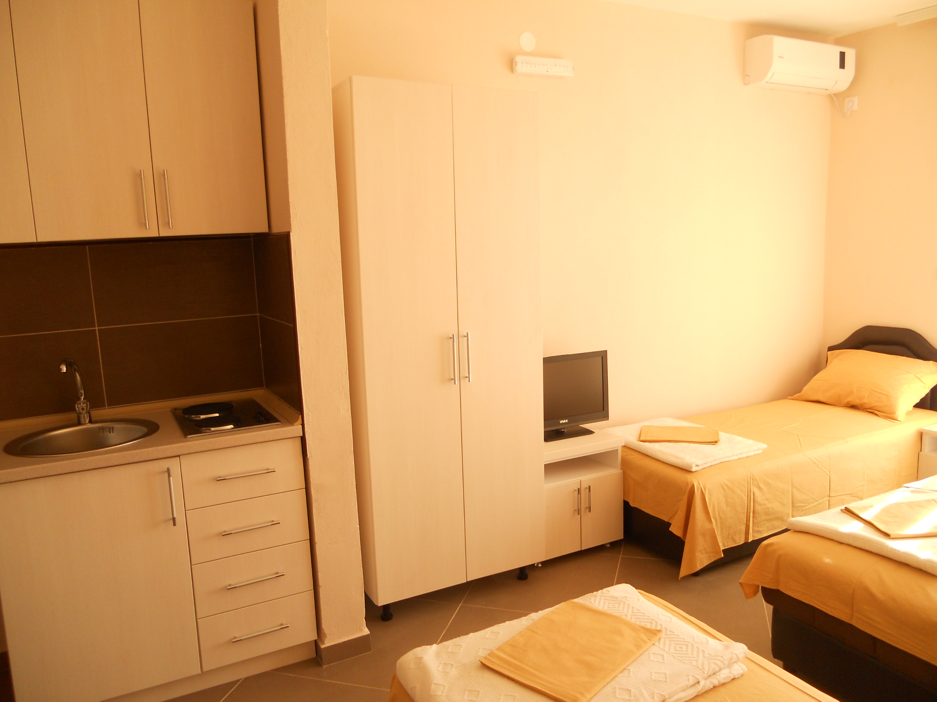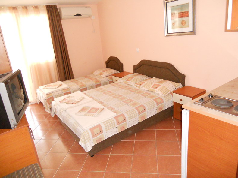 Moderno opremljeni studio apatrtmani za dve , tri ili četiri osobe poseduju sopstveno kupatilo sa tušem, terasu, TV, Wi-FI internet, frižider, klimu, mini kuhinju sa kompletnom opremom.