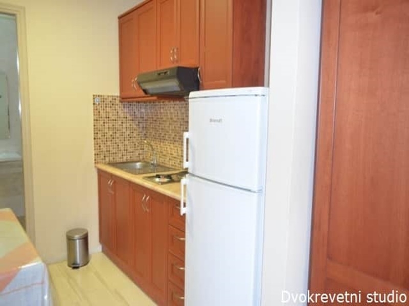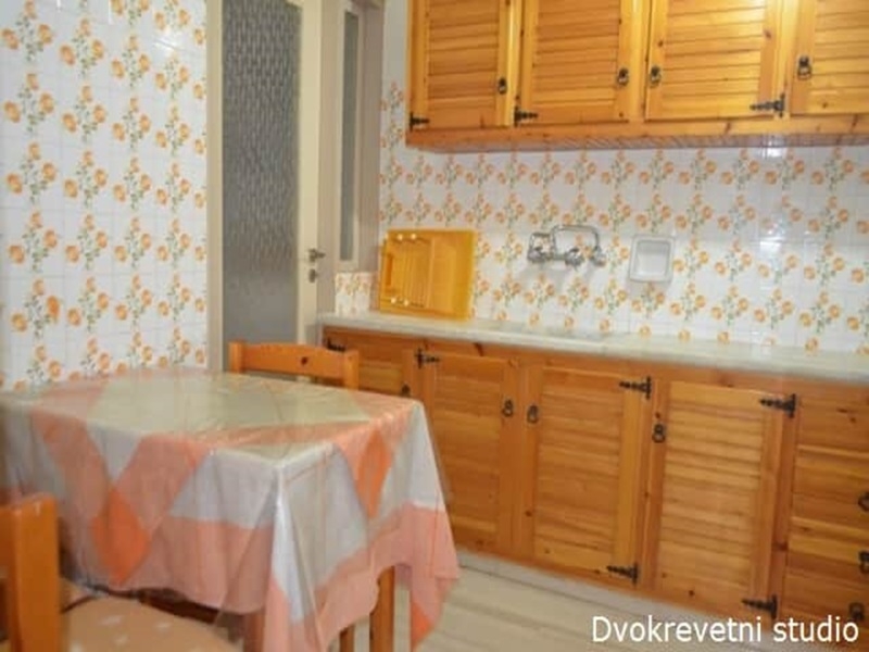 Sadržaj soba: U ponudi imamo prostrane dvokrevetne i trokrevetne apartmane u prizemlju, visokom prizemlju i spratu i opremljeni su čajnom kuhinjom (veliki frižider, posuđe i mini električni šporet) namenjenu za pripremu lakih obroka, kupatilom, klimom koja se doplaćuje 5eur dnevno, malim LCD TV-om. Apartmani se sastoje od prostrane izdvojene kuhinje u kojoj ima sto za ručavanje i spavaćeg dela u kome se nalazi francuski krevet. Sve smeštajne jedinice imaju manje, uske terase na kojima su garniture za sedenje ili samo dve stolice sa stočićem.