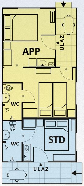 Duplex (1/4+1 dpx) - sastoji se od dve sobe, u jednoj sobi nalazi se francuski ležaj, u drugoj soba dva singl ležaja, u kuhinjskom delu nalazi se sofa koja se ne razvlači, koji sadrži manji šporet sa dve ringle i rernom, veliki frižider, sudoperu i elemente sa osnovnim kuhinjskim inventarom.