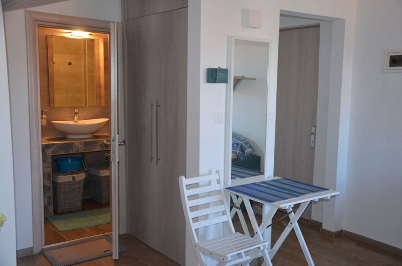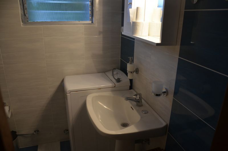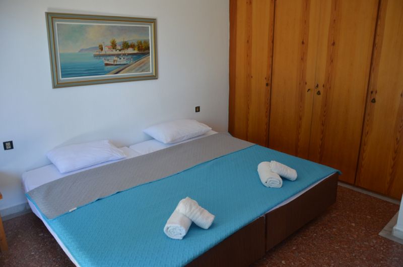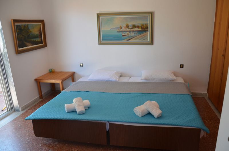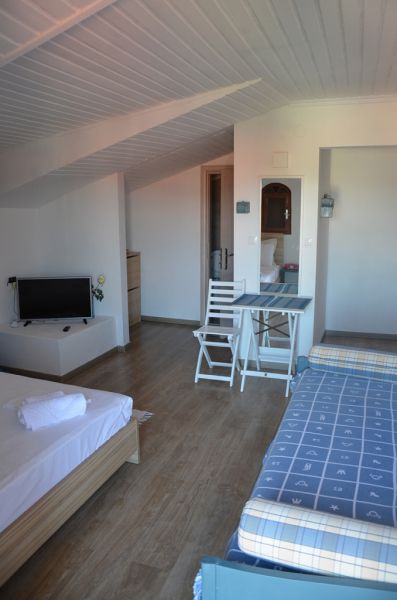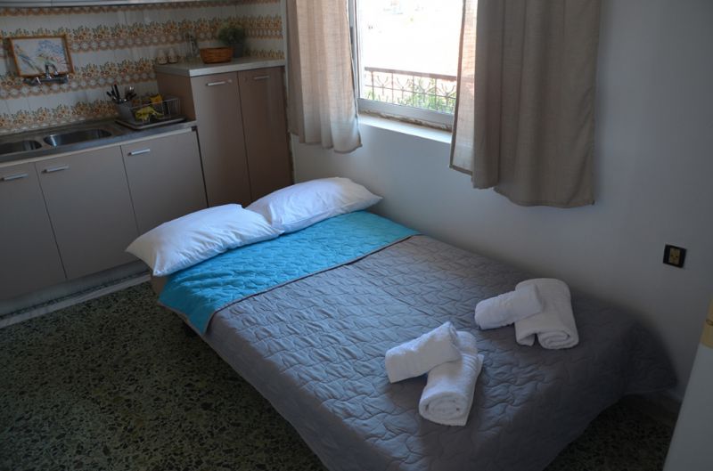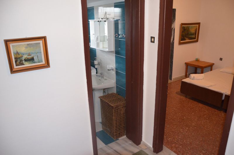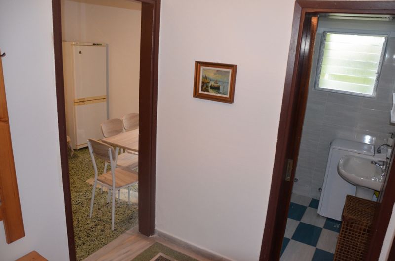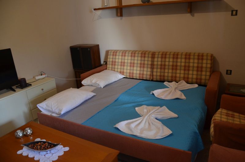 DVOKREVETNI STUDIO: Dvokrevetni studio se nalazi na drugom spratu vile FANI. Potpuno renovirani studio se sastoji od Francuskog kreveta dimenzija 160x190cm, dva manja noćna stočića, lampe, stola za ručavanje za dve osobe, TV, klima uredjaj (besplatno), veliki ormar, cipelarnik. U drugoj prostoriji koja je odvojena zavesom se nalazi kuhinja, koja u svom sastavu sadrži duplu sudoperu, mini šporet sa tri ringle i rernom, normalan frižider sa malom komorom za zamrzavanje. Kuhinja takodje sadrži neophodno posuđe za dve osobe. Kupatilo je novo i veoma funkcionalno. Sastoji se od zidane tuš kabine koja se zatvara zavesom, lavaboa i manje veš mašine. Iz spavaće sobe se izlazi na terasu, sa koje se pruža prelep pogled ka moru i Sitoniji. Na terasi se nalazi sto sa dve stolice.