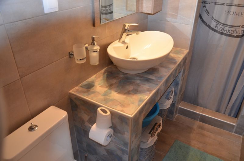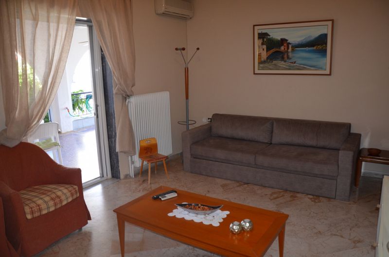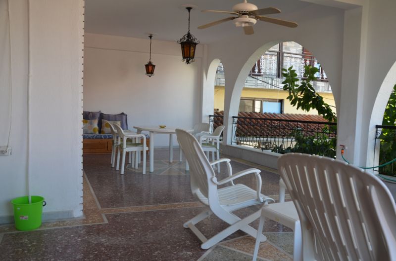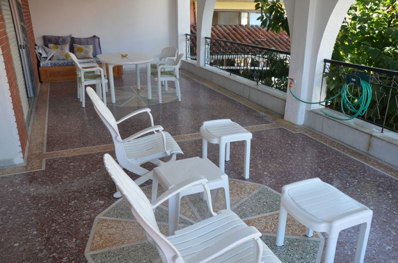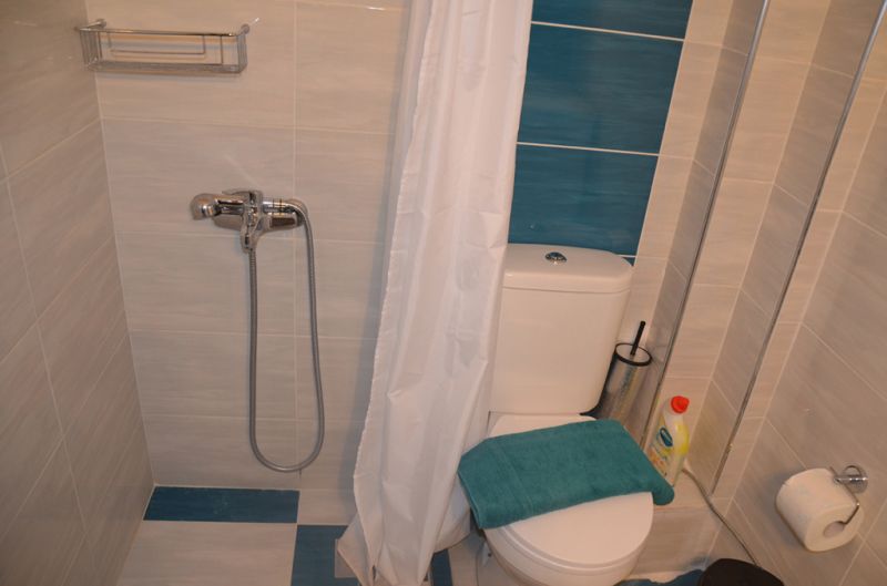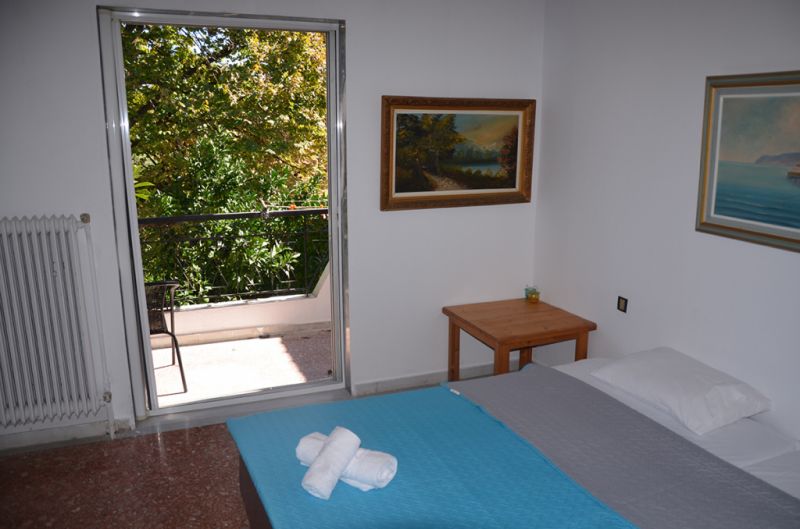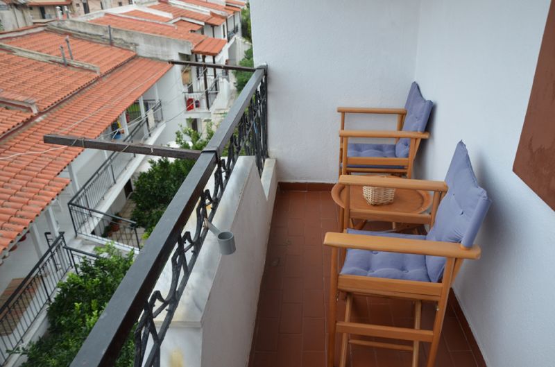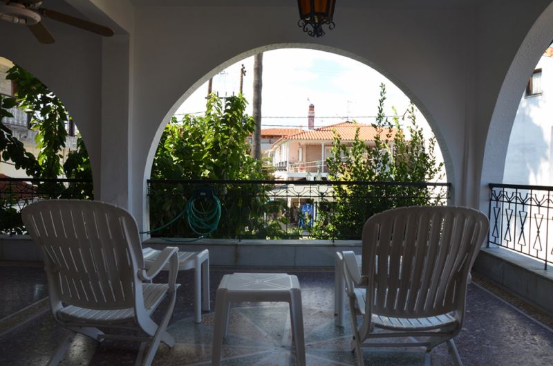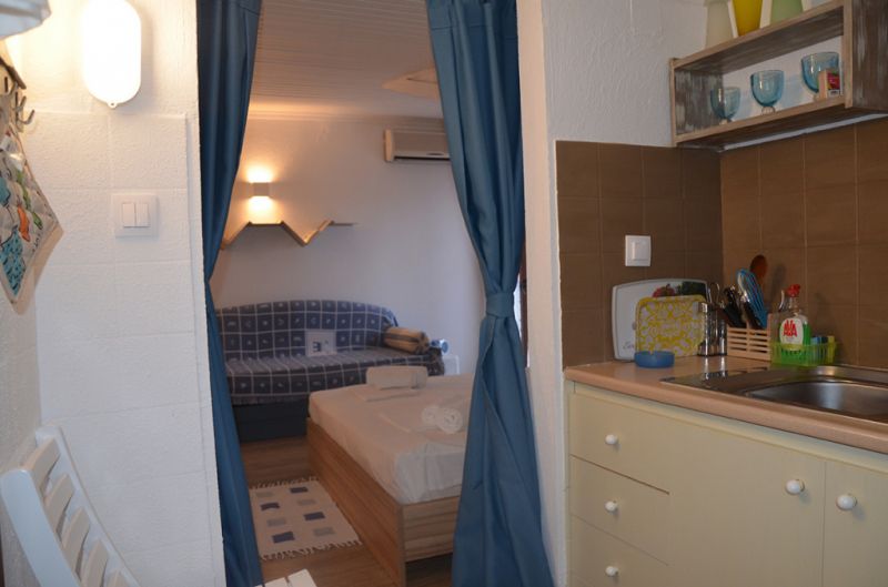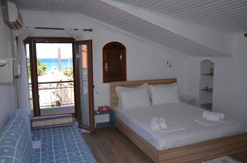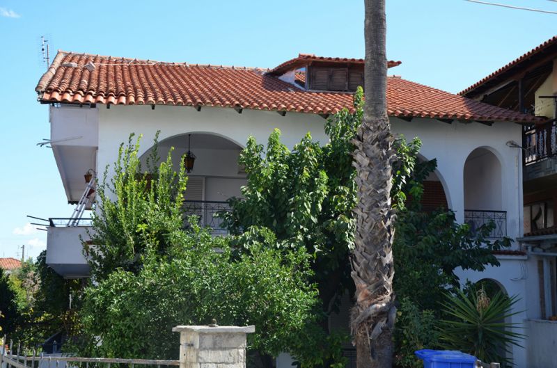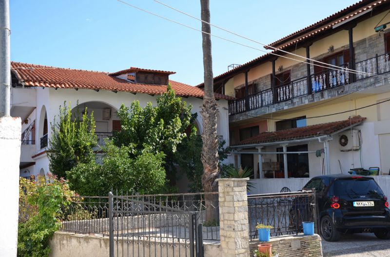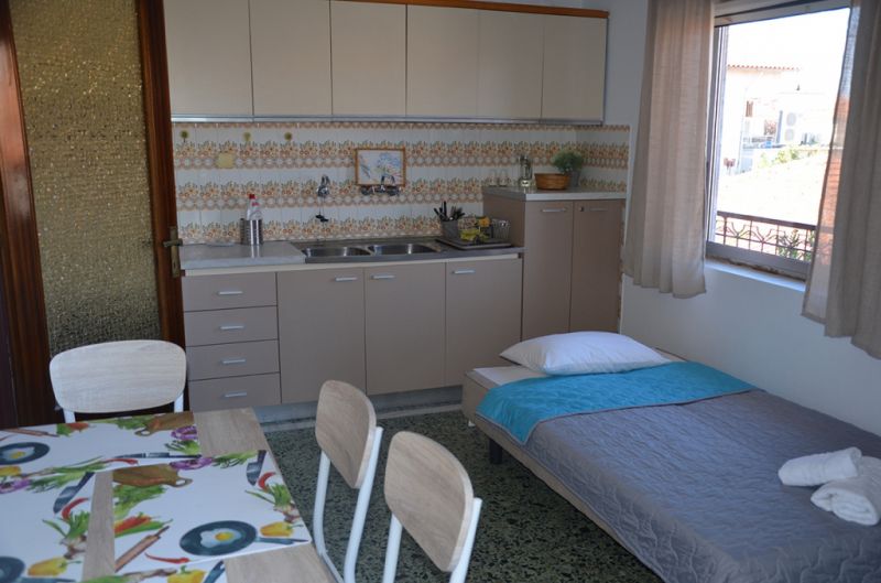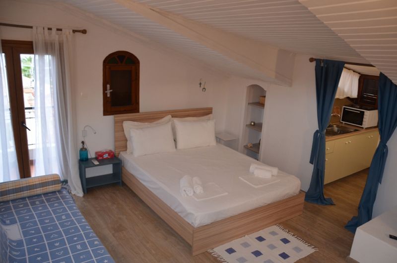 STUDIO 1/2+1: Trokrevetni studio se nalazi na drugom spratu vile FANI. Potpuno renovirani studio se sastoji od Francuskog kreveta dimenzija 160x190cm za dve osobe, i jednom sofom za jednu osobu, dva manja noćna stočića, lampe, stola za ručavanje za tri osobe, TV, klima uredjaj (besplatno), veliki ormar, cipelarnik. U drugoj prostoriji koja je odvojena zavesom se nalazi kuhinja, koja u svom sastavu sadrži duplu sudoperu, mini šporet sa tri ringle i rernom, normalan frižider sa malom komorom za zamrzavanje. Kuhinja takodje sadrži neophodno posuđe za dve osobe. Kupatilo je novo i veoma funkcionalno. Sastoji se od zidane tuš kabine koja se zatvara zavesom, lavaboa i manje veš mašine. Iz spavaće sobe se izlazi na terasu, sa koje se pruža prelep pogled ka moru i Sitoniji. Na terasi se nalazi sto sa dve stolice. Pefkohori apartmani