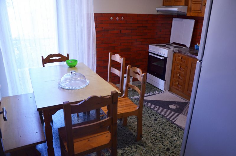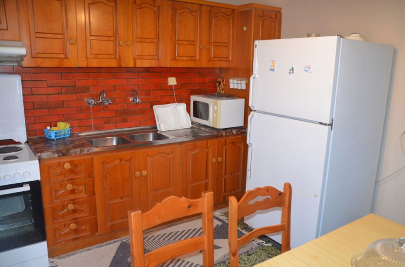 APARTMAN 1/3+1: Apartman 1/3+1 se nalazi na prvom spratu vile FANI i sastoji se od predsoblja sa garderoberom, iz koga se ulazi u spavaću sobu, kupatilo i trpezariju sa kuhinjom. Spavaća soba je izuzetno prostrana i sastoji se od dva spojena singl ležaja veličine 110x190cm po krevetu, velikog ormara, TV, sto, noćni sto, Iz spavaće sobe se izlazi na veoma prostranu i dugačku terasu koja gleda ka dvorištu vile. Prostrana trpezarija se sastoji od kreveta na razvlačenje koji kad se razvuče ima dimenzije 110x190cm, kuhinje u kojoj je veliki šporet sa četiri ringle i velikom rernom, duplom sudoperom, potpuno opremljen posuđem za četiri osobe. velikim frižiderom sa posebnom komorom za zamrzavanje, veliki sto za ručavanje sa četiri stolice. Klima uređaj se nalazi u kuhinji i okrenut je ka hodniku i spavaćoj sobi, a upotreba klima uređaja je besplatna. Direktan izlaz iz trpezarije na terasu koja je spojena sa terasom iz spavaće sobe i predstavlja jednu veliku celinu. Iz predsoblja se takođe ulazi u kupatilo, tako da gosti iz spavaće sobe i trpezarije neće smetati jedno drugom. Kupatilo je potpuno renovirano i poseduje tuš sa zavesom, veš mašinu, prozor, lavabo i kao i ormaric za kozmetiku.